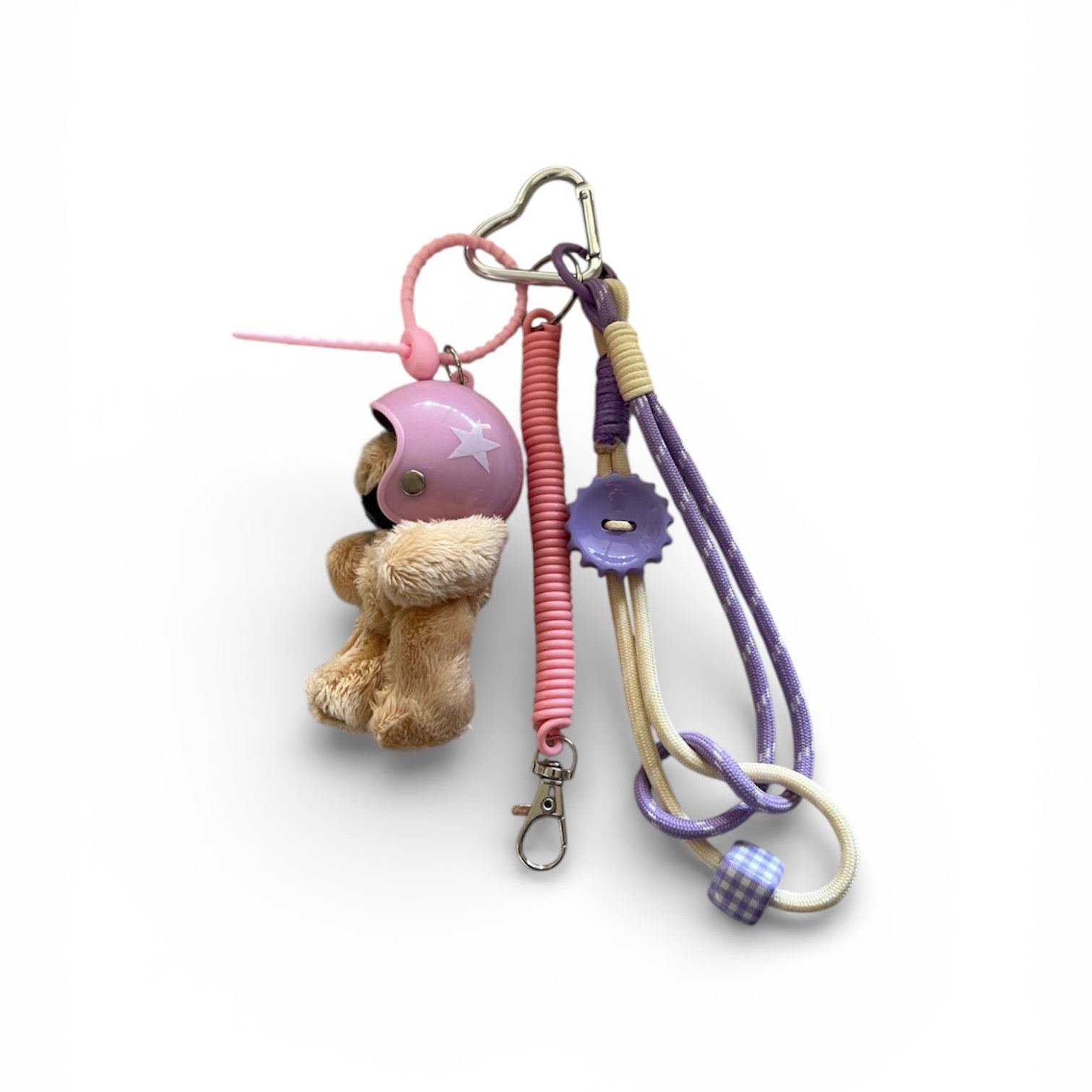 Avec son petit teddy protégé par un casque rose, ses cordons pastel lilas et crème et ses détails ludiques, il mixe douceur et originalité sans en faire trop.