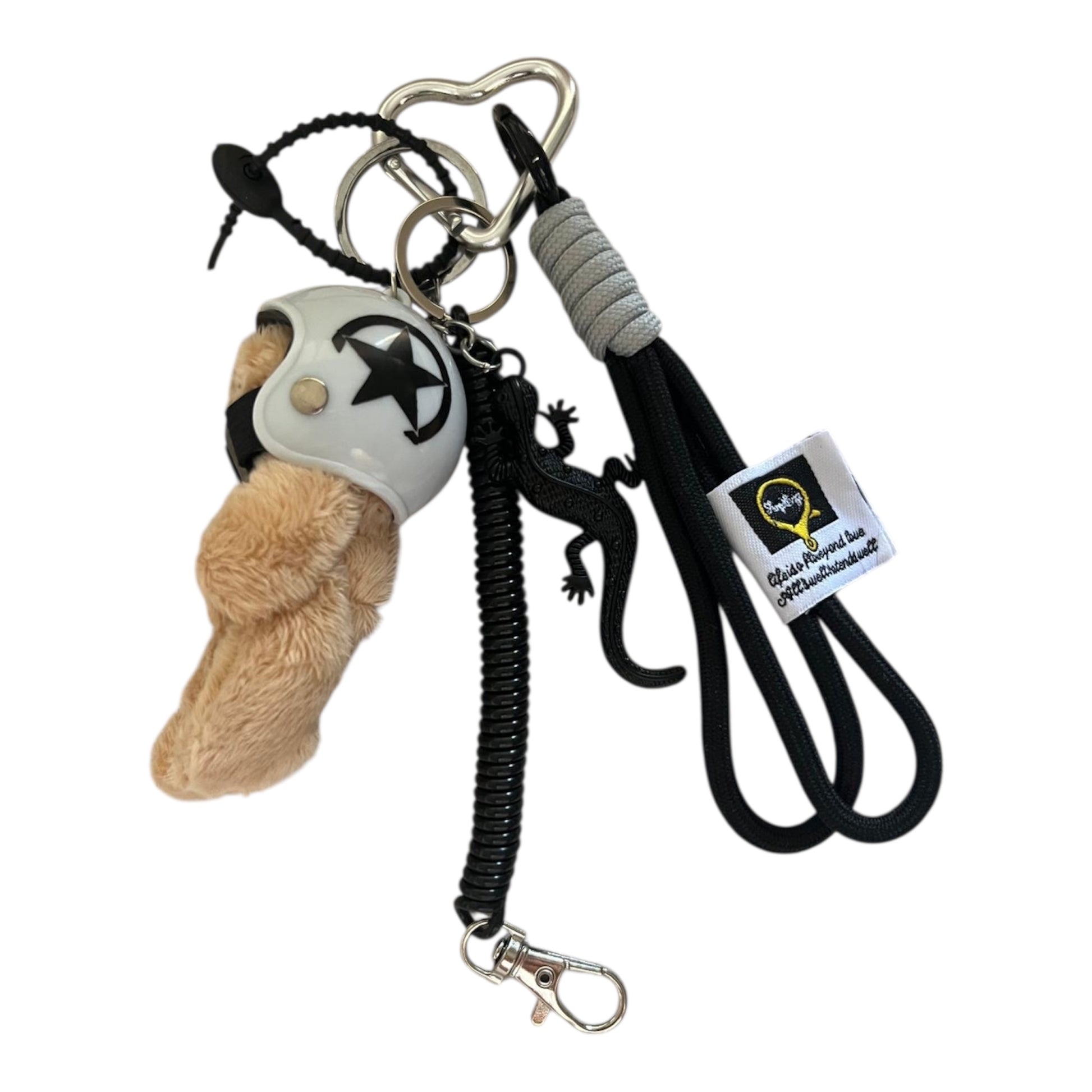 Accessoire de sac au style affirmé, composé d’un teddy en peluche coiffé d’un casque blanc étoilé, associé à des cordons noirs, un mousqueton cœur et des détails graphiques. Une pièce forte qui mixe esprit biker, touches street et douceur iconique.