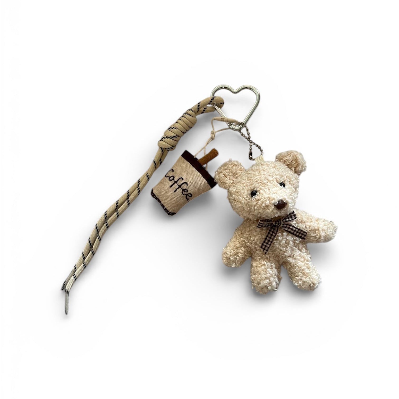 Coffee Bear associe un petit ourson texturé, un détail tasse de café brodée et un lacet aux tons naturels. Une pièce décorative qui apporte une touche cozy et élégante à ton sac, entre douceur et style du quotidien.
